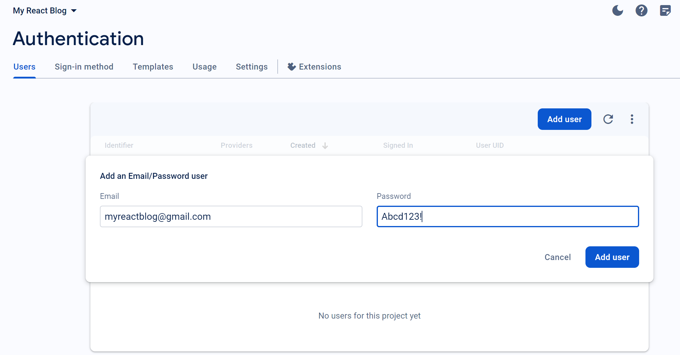 여기는 간단하게 myreactblog@gmail.com/Abcd123! 라는 테스트 사용자를 생성하겠습니다.