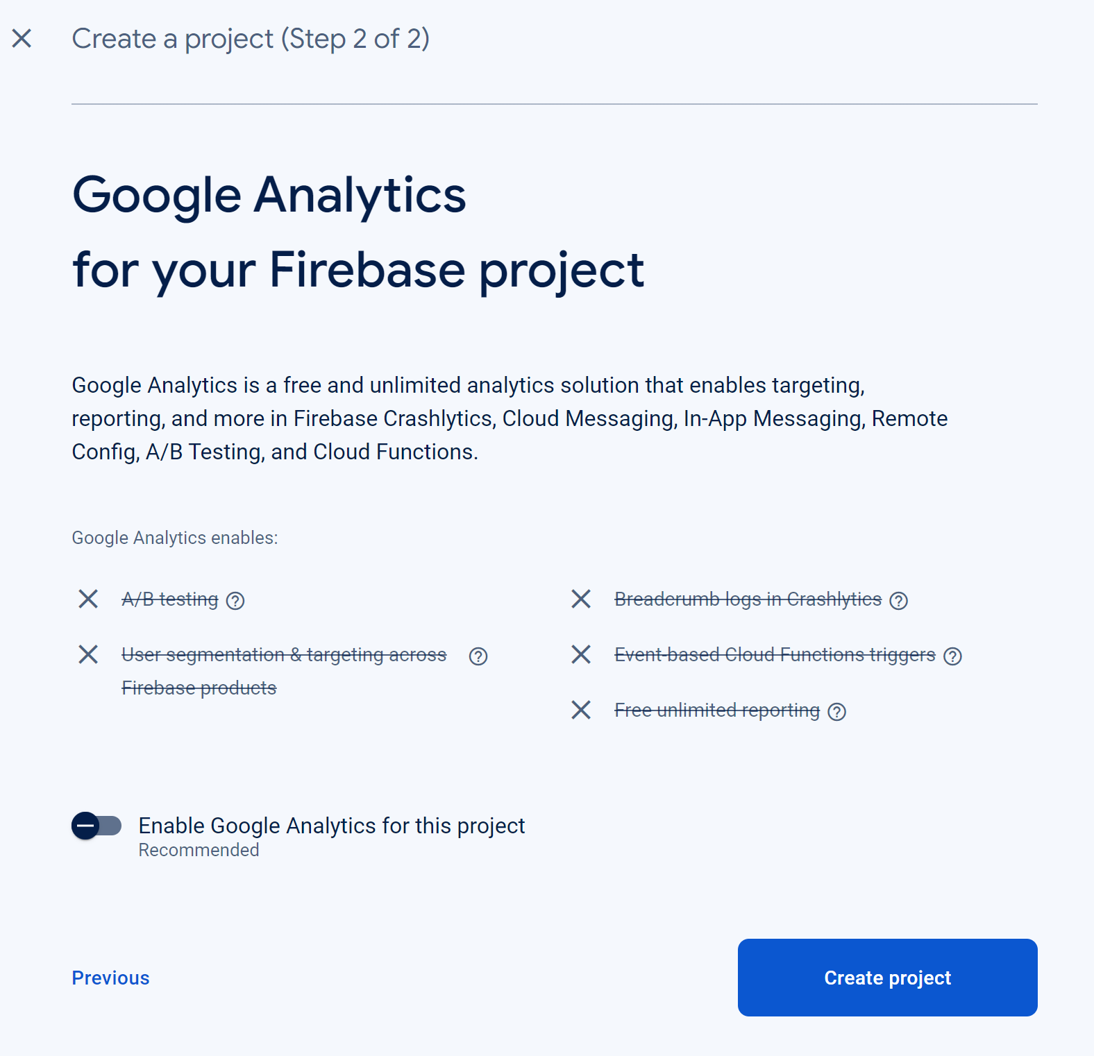 다음으로 구글 분석을 사용할것이라고 묻는 화면이 나오는데 여기서는 간단한 인증만을 사용할 예정이므로 여기서는 비활성화 시키고 진행합니다. Create project 버튼 클릭으로 진행합니다.