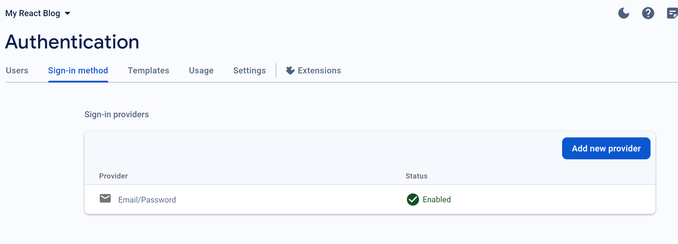 이메일/비밀번호 인증이 활성화 되고 사용자 인증을 추가할수 있는 Add new provider버튼이 보입니다.