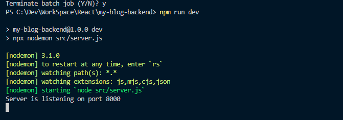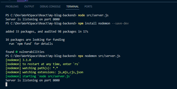 이제 이 명령어를 통해서 서버가 지속적으로 실행 되고 소스가 업데이트될때마다 자동으로 서버를 새로 고치고 다시 시작합니다.