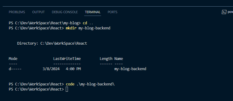 그러기 위해서 Terminal에서 새로운 폴더를 구성하여 Back End 프로젝트를 생성합니다. 명령어는 아래와 같습니다.