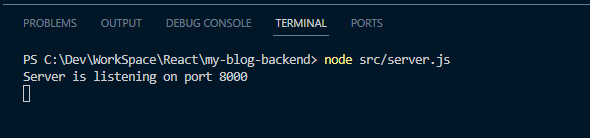 서버 확인을 위해 다음 명령어를 실행해서 "Server is listening on 8000" 이 표시 되는지 확인합니다.