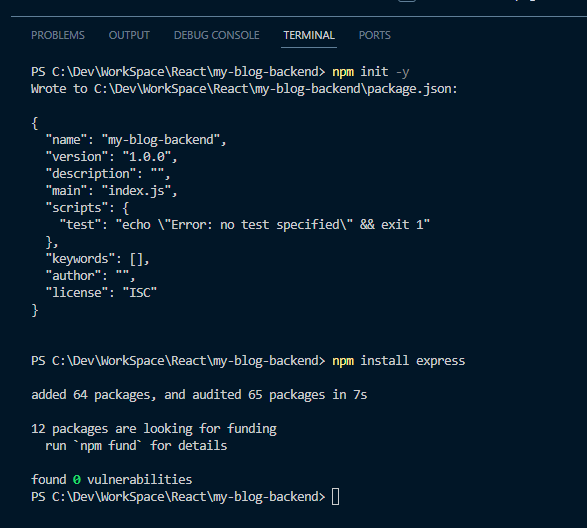 package.json파일이 생성되고 이제 Express를 설치합니다. 명령어는 다음과 같습니다.