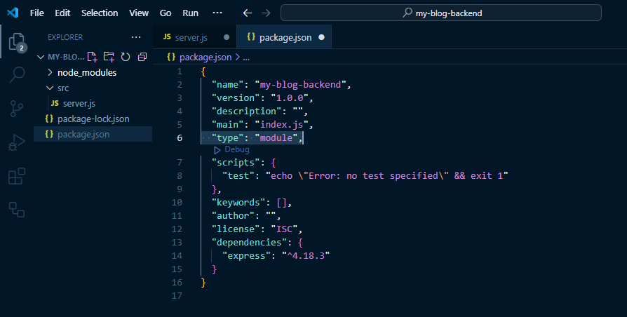 import, export같은 최신 javascript 구문을 사용할수 있도록 pakage.json파일에 다음 구문을 추가해줍니다.