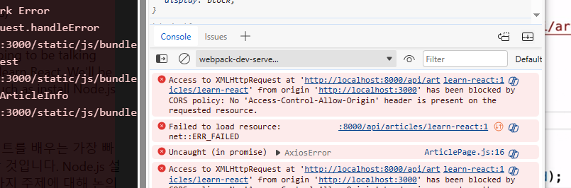 서버가 실행되어있지 않으면 아래와 같은 에러가 발생합니다.