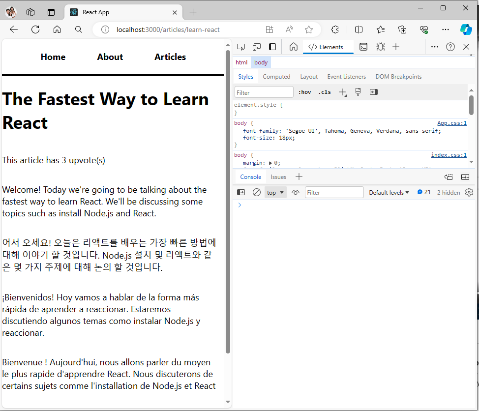 이렇게 변경한후 ArticlePage.js파일 안에 접속 Url도 수정해줍니다. 다시 고친 코드는 다음과 같습니다.