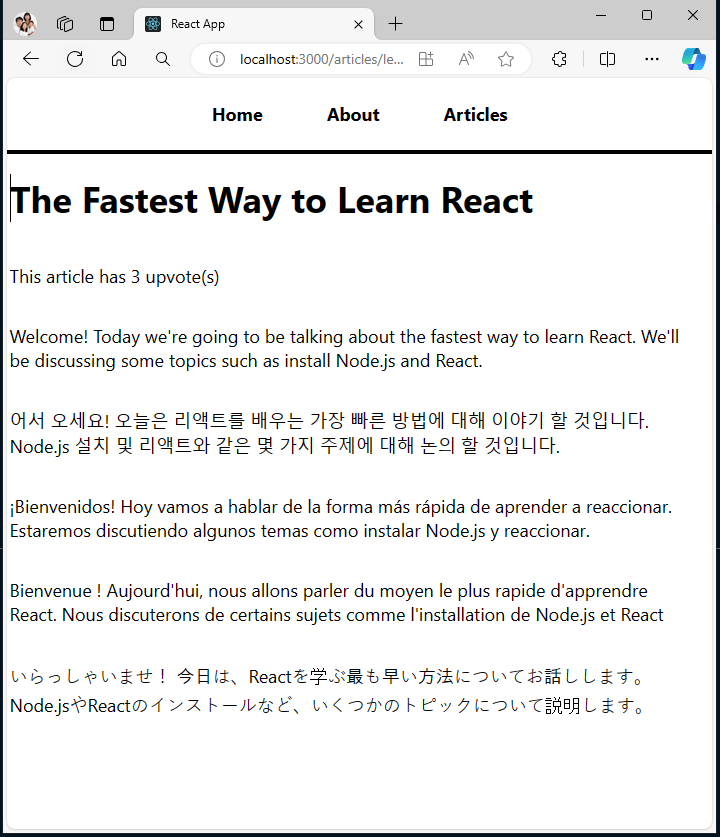 서버에서 문서 페이지로 데이터를 로드하는 방법을 살펴보겠습니다. 현재 페이지의 컴포넌트 중 어느것도 실제로 어떤 종류의 메모리도 가지고 있지 않습니다. 그 자체로 매개 변수로 요청을 받아서 그대로 결과를 뿌려주는 형태입니다. 이제 여기에 서버에서 반환하는 응답을 저장할 장소를 제공하도록 하겠습니다. 상태와 효과를 추가해주는 React hook을 사용합니다. 변경한 코드는 아래와 같습니다. ArticlePage.js import { useState, useEffect } from 'react'; import { useParams } from 'react-router-dom'; import NotFoundPage from './NotFoundPage'; import articles from './articl..